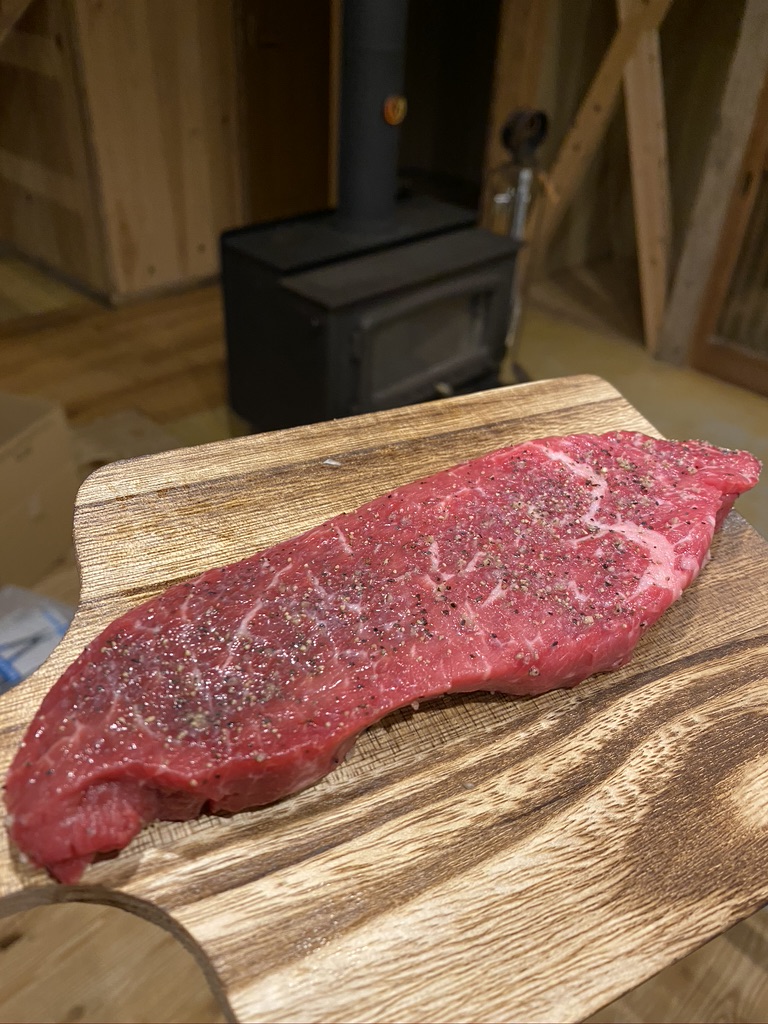 100円均一で手軽に入手できた味塩コショウで下味をつけます。肉はタスマニアビーフ。500円。