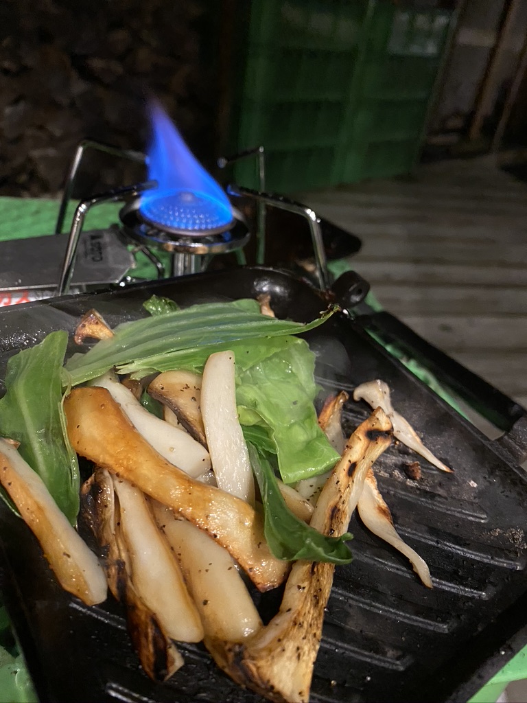 エリンギと1玉100円で買ったキャベツをホットサンドプレートで両面焼くだけ。蒸し焼きになって火は通るし、表面は香ばしい。