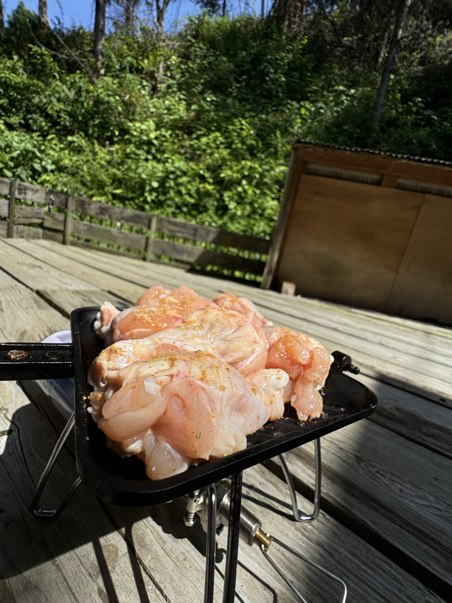 鳥の手羽元のお肉を近くのクリエイトで購入してホットサンドプレートで焼くだけです。