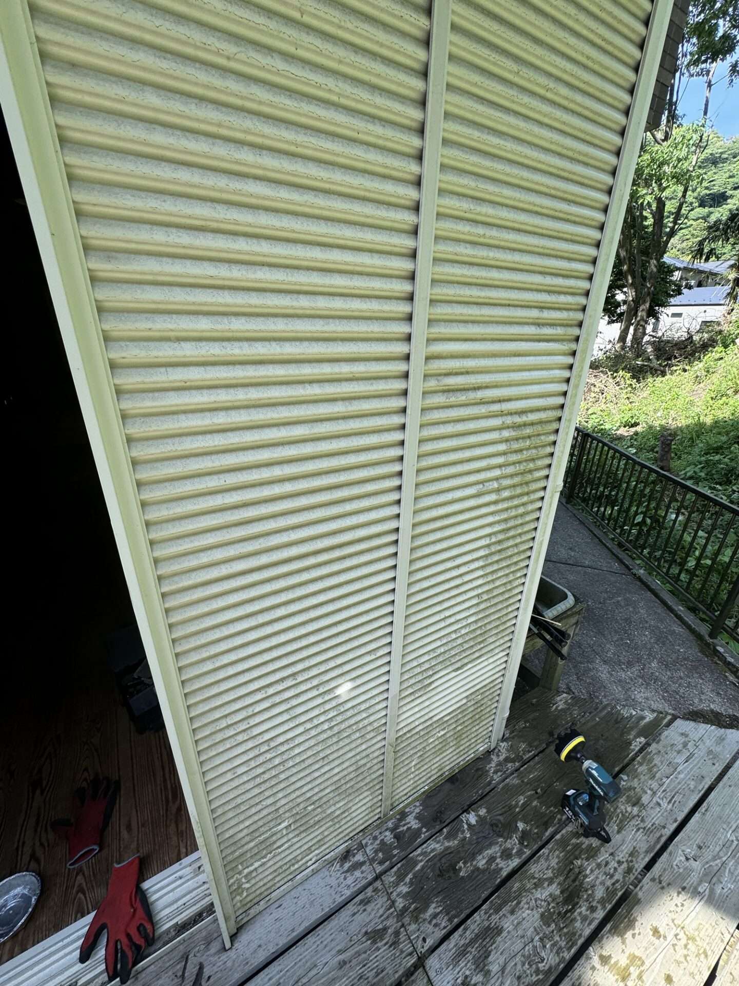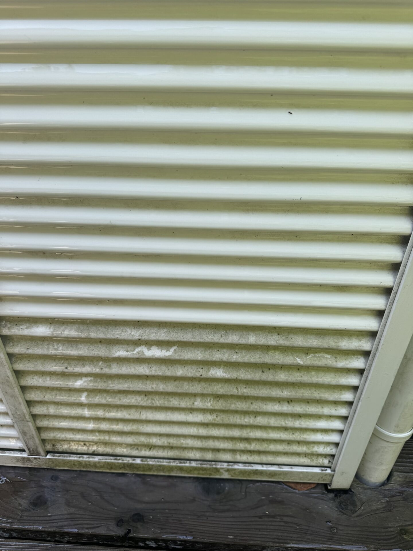 そして、雨戸のケースがコケで汚れているので掃除します。インパクトドライバーに風呂掃除用のスポンジを取り付けて掃除しました。