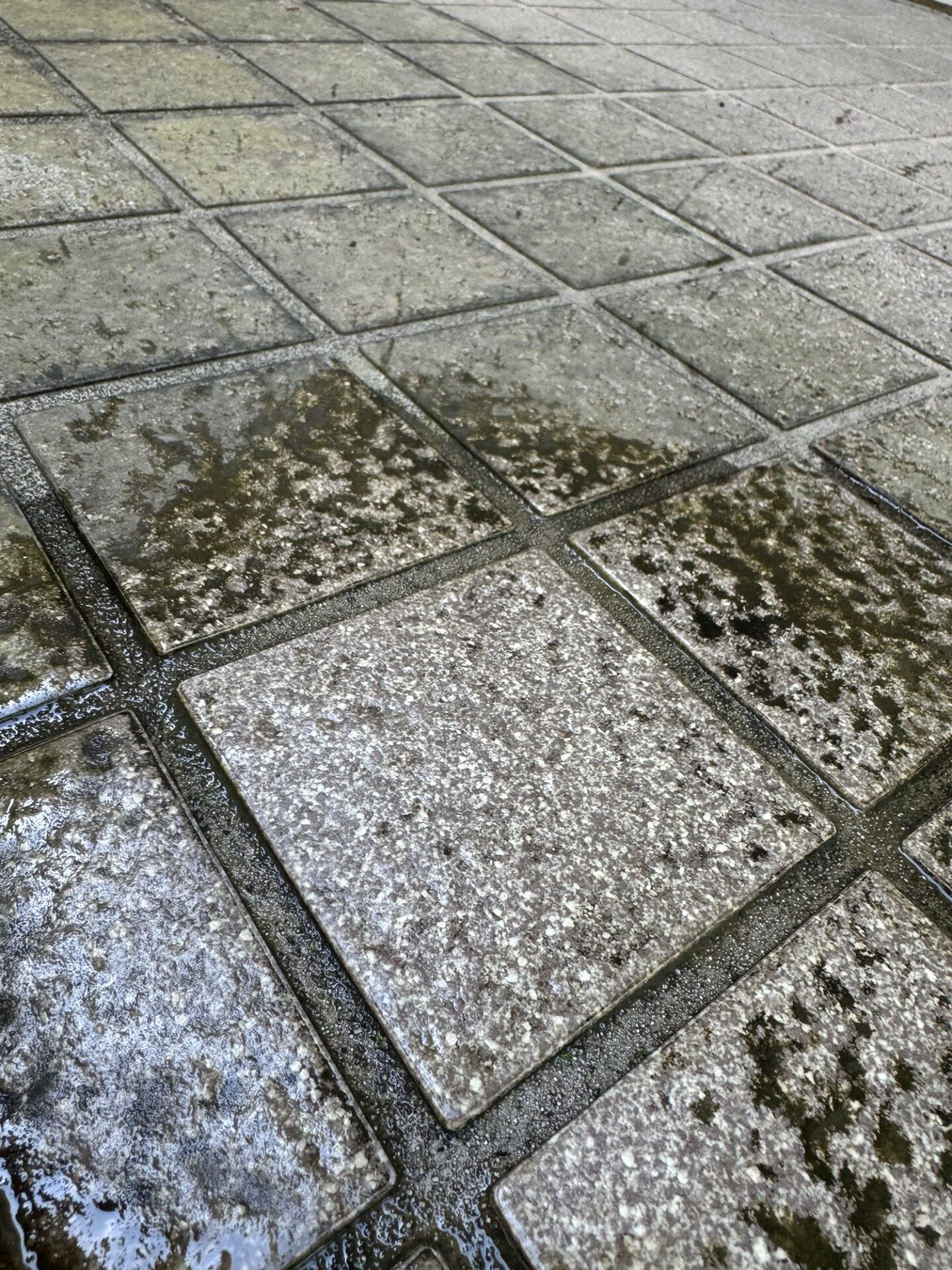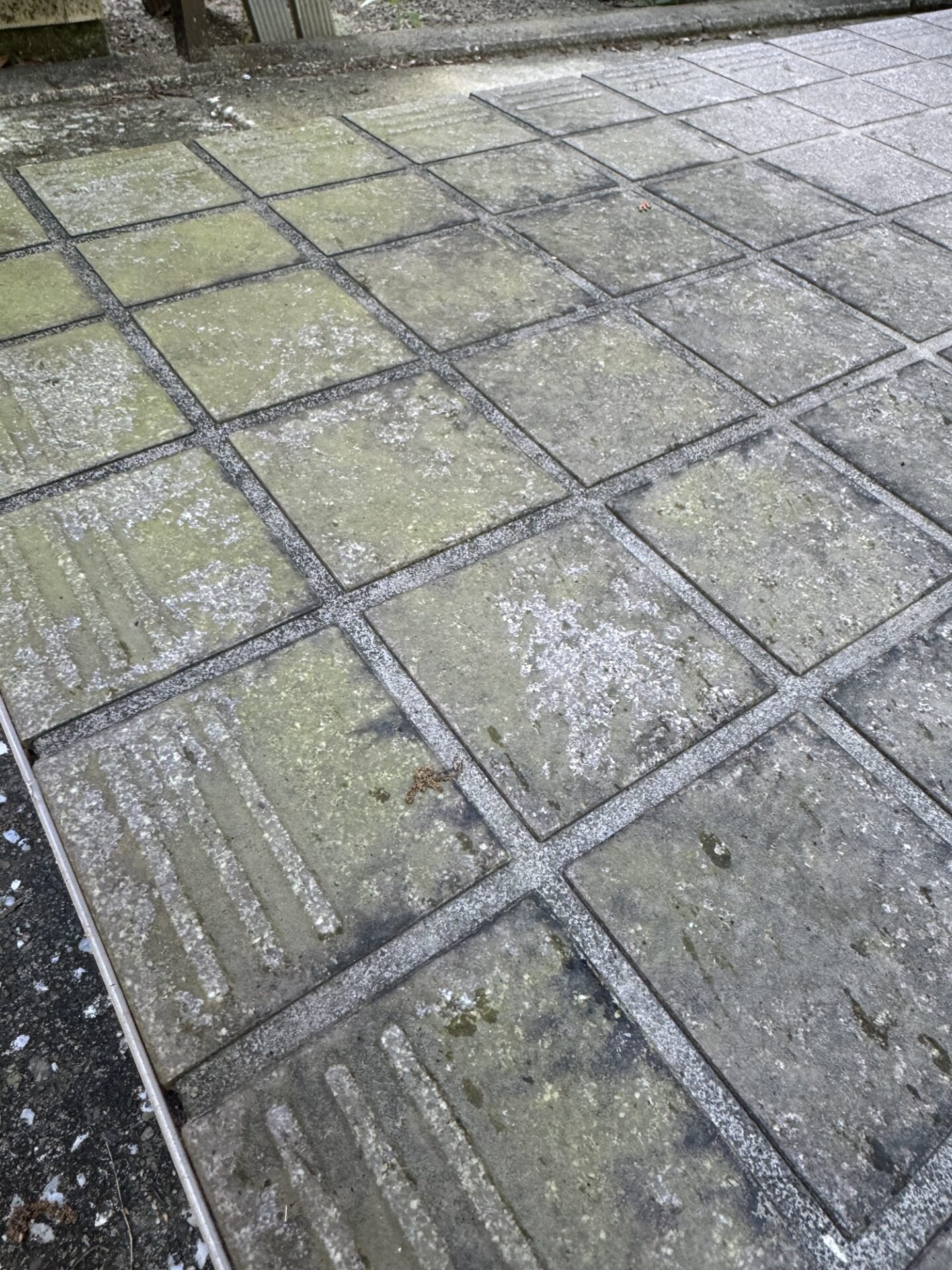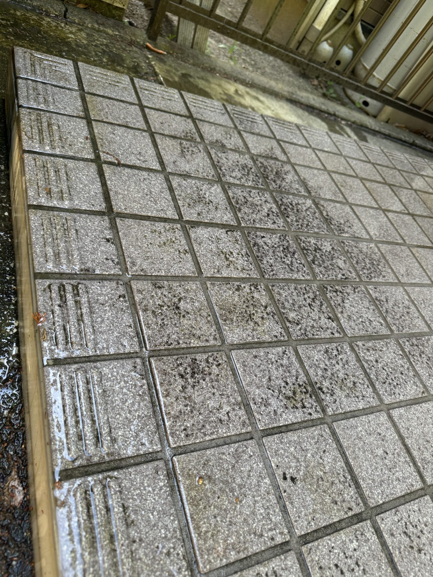 エントランスのタイルも掃除。太陽が当たらなかった時に生えたコケかなと思います。