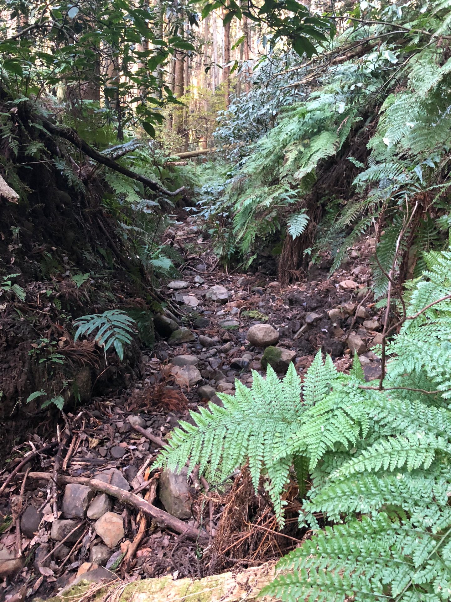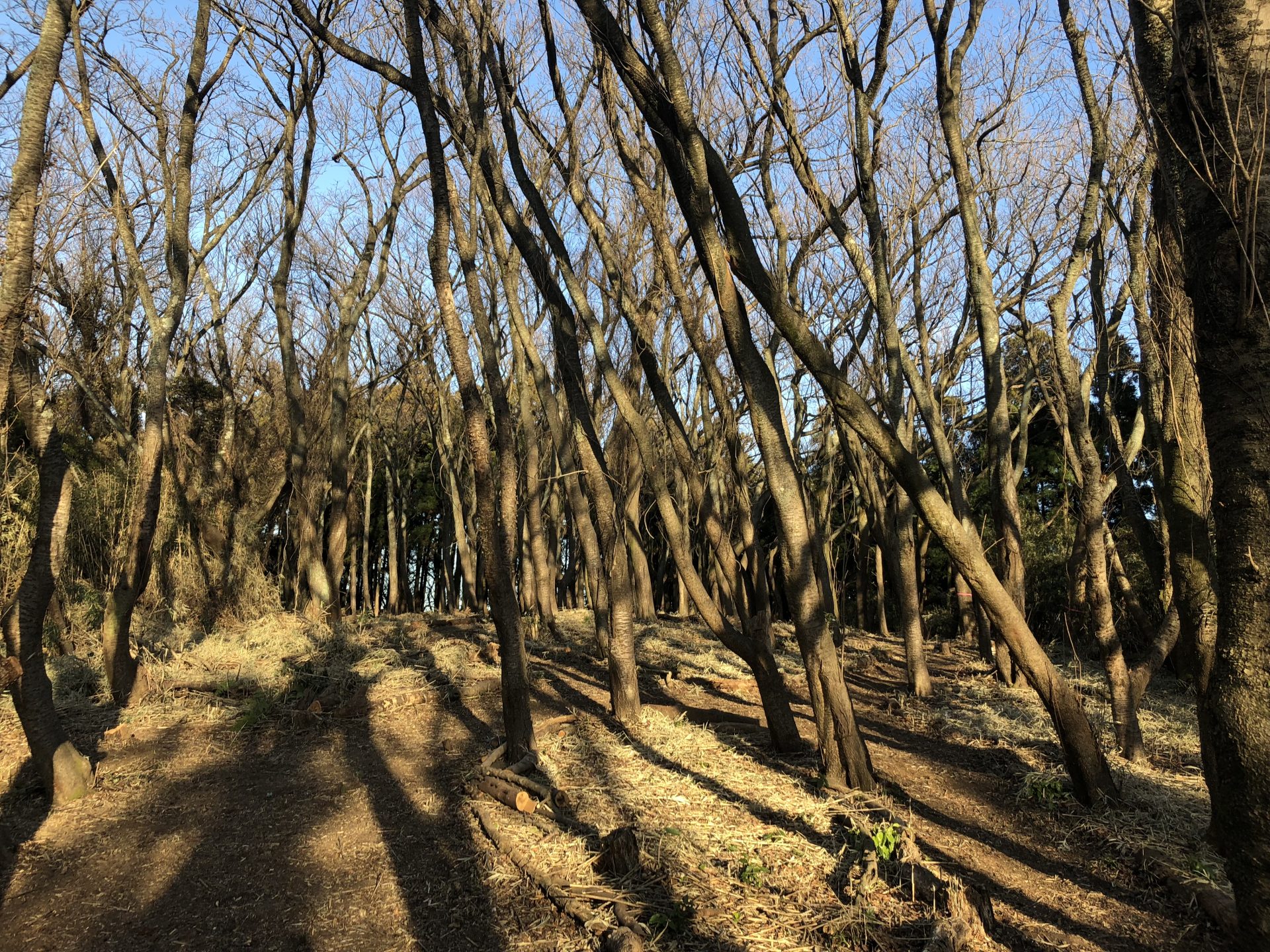 下山時は、途中で見つけた分岐を選び、別のルートを試してみます。茂みが多く道が分かりにくい状態です。冬の草が少ない時期でかろうじて判別できる程度です。