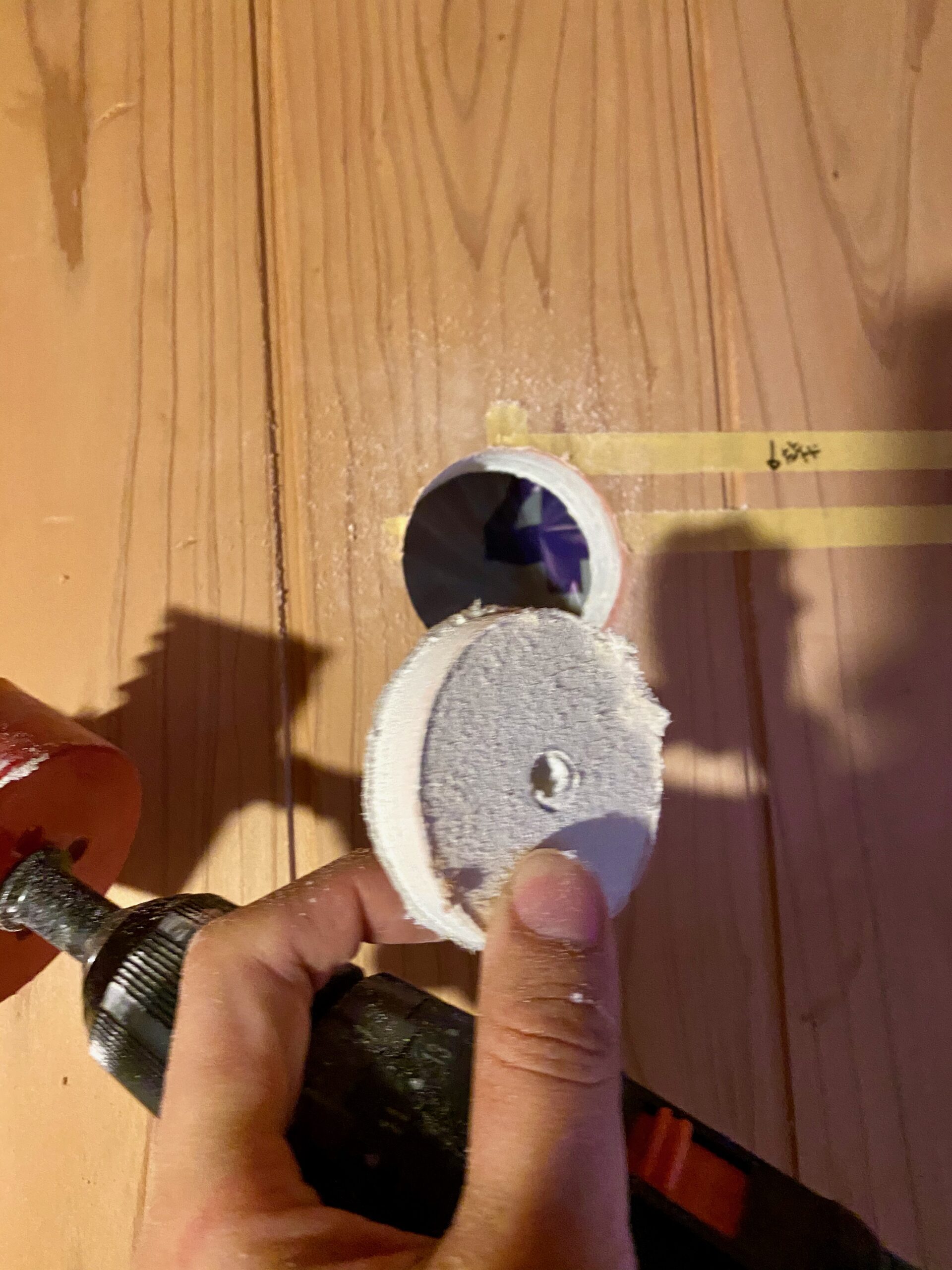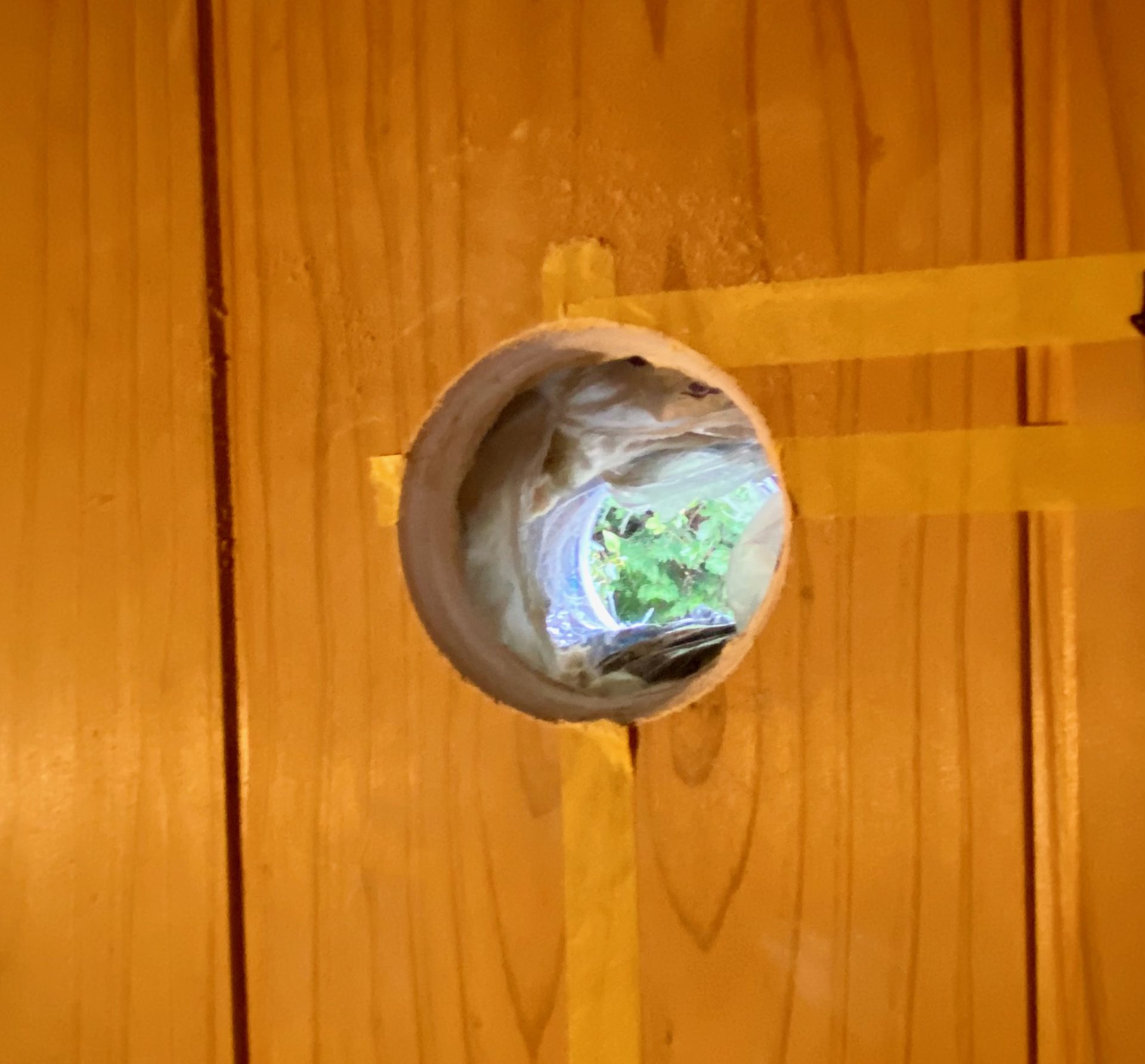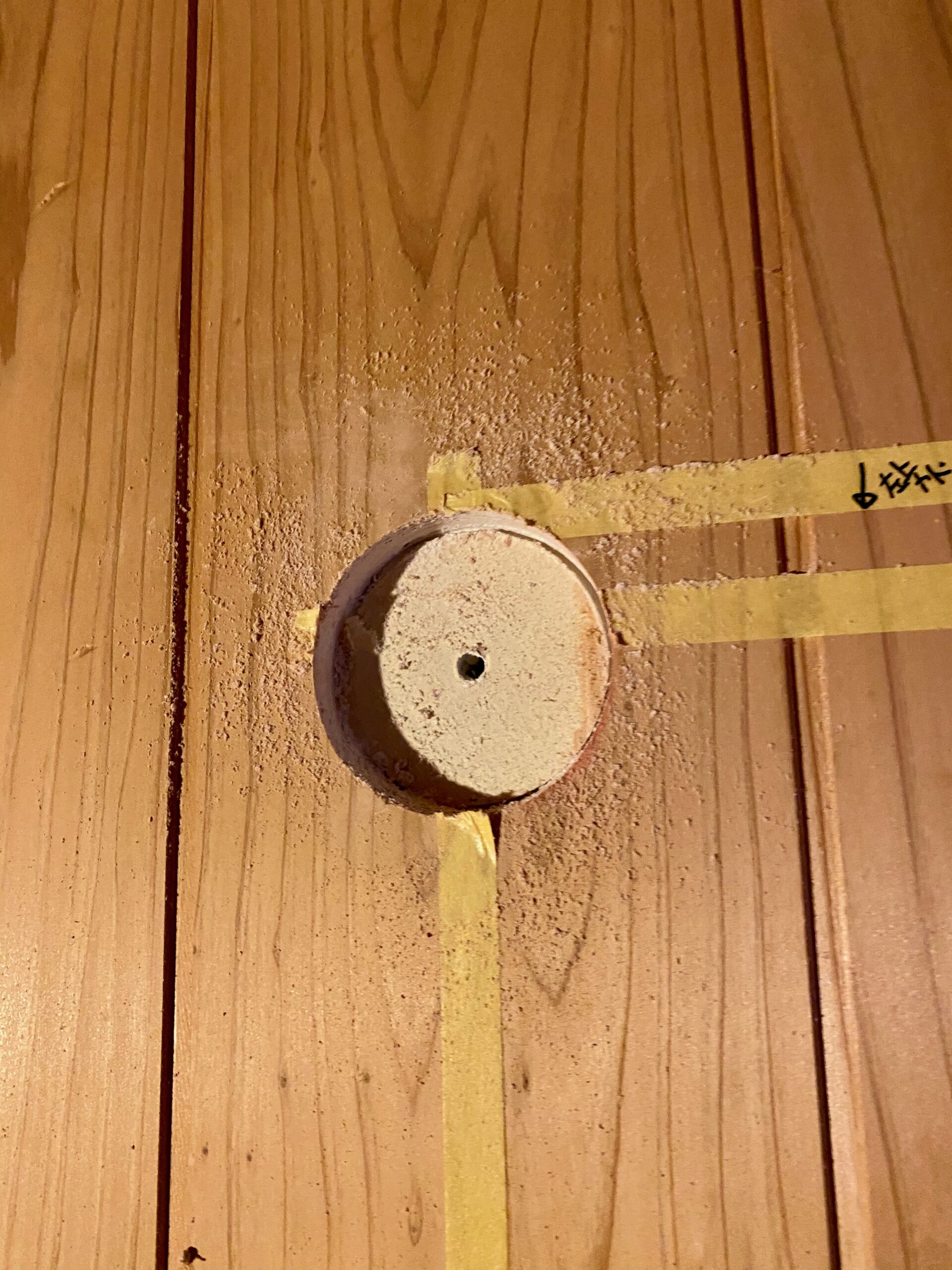 バルコニー側からも穴を開けるために中心に目安の穴を開けます。ホースに勾配を取る必要があるので、少し下側に穴を開けます。