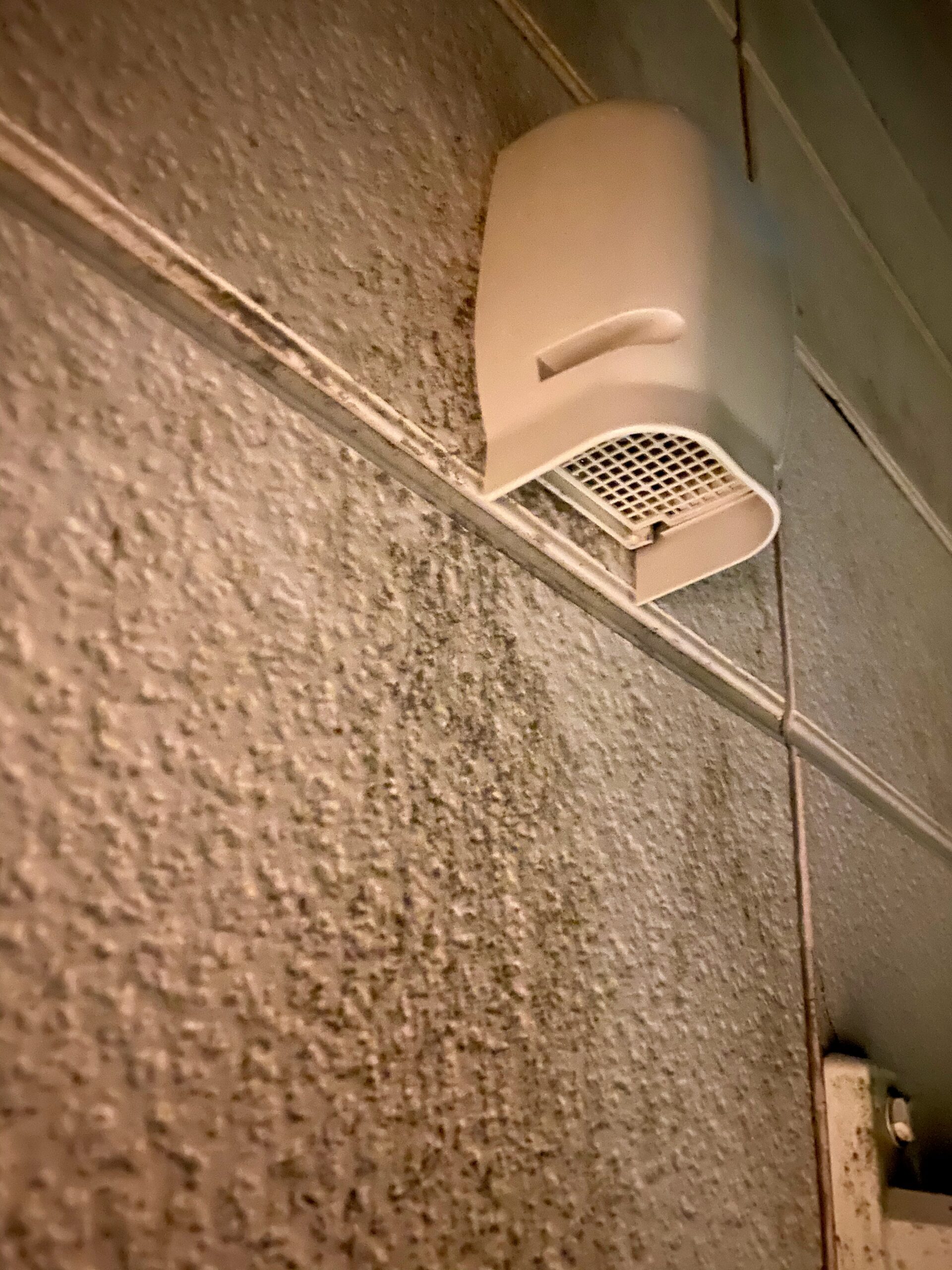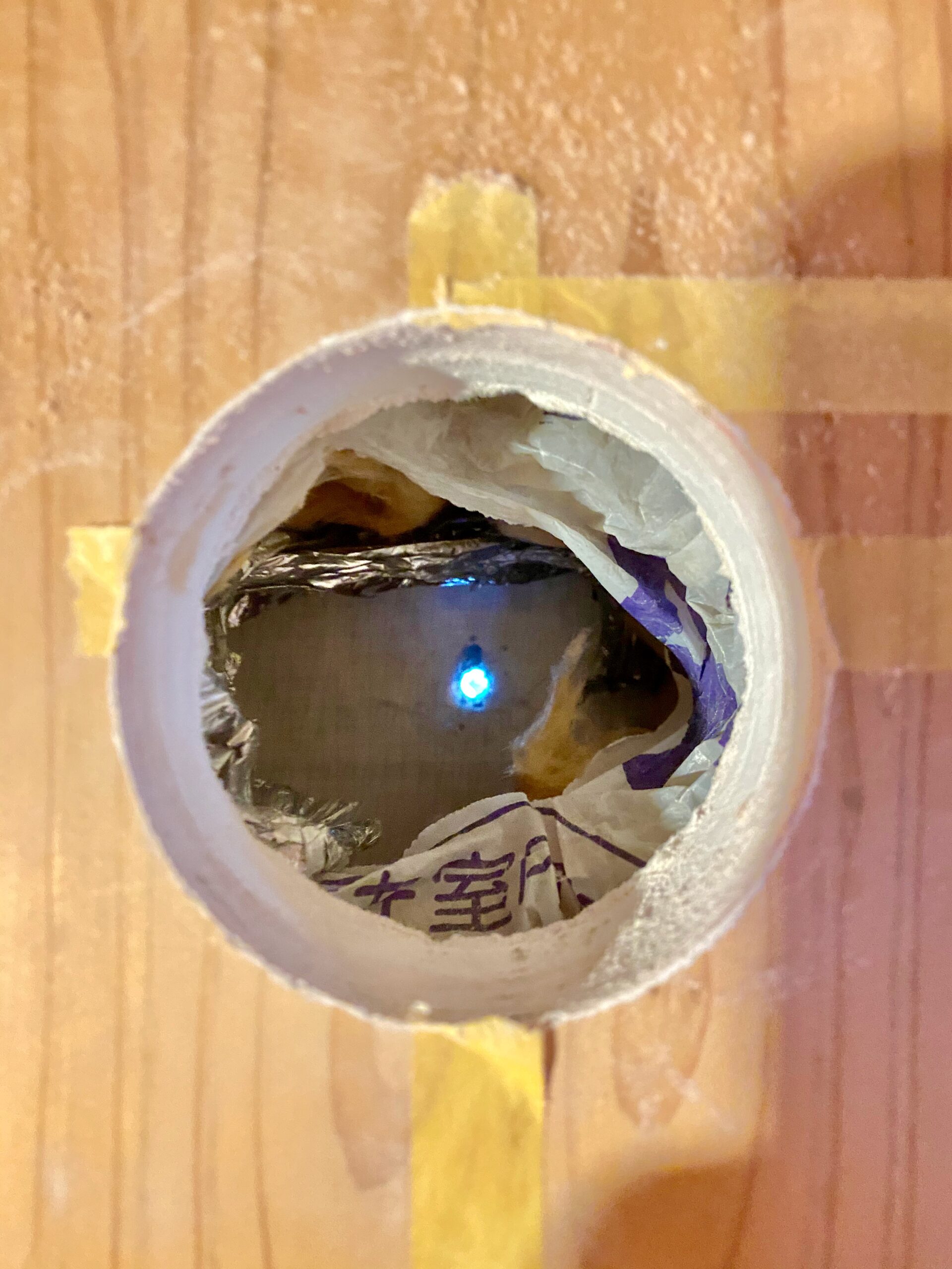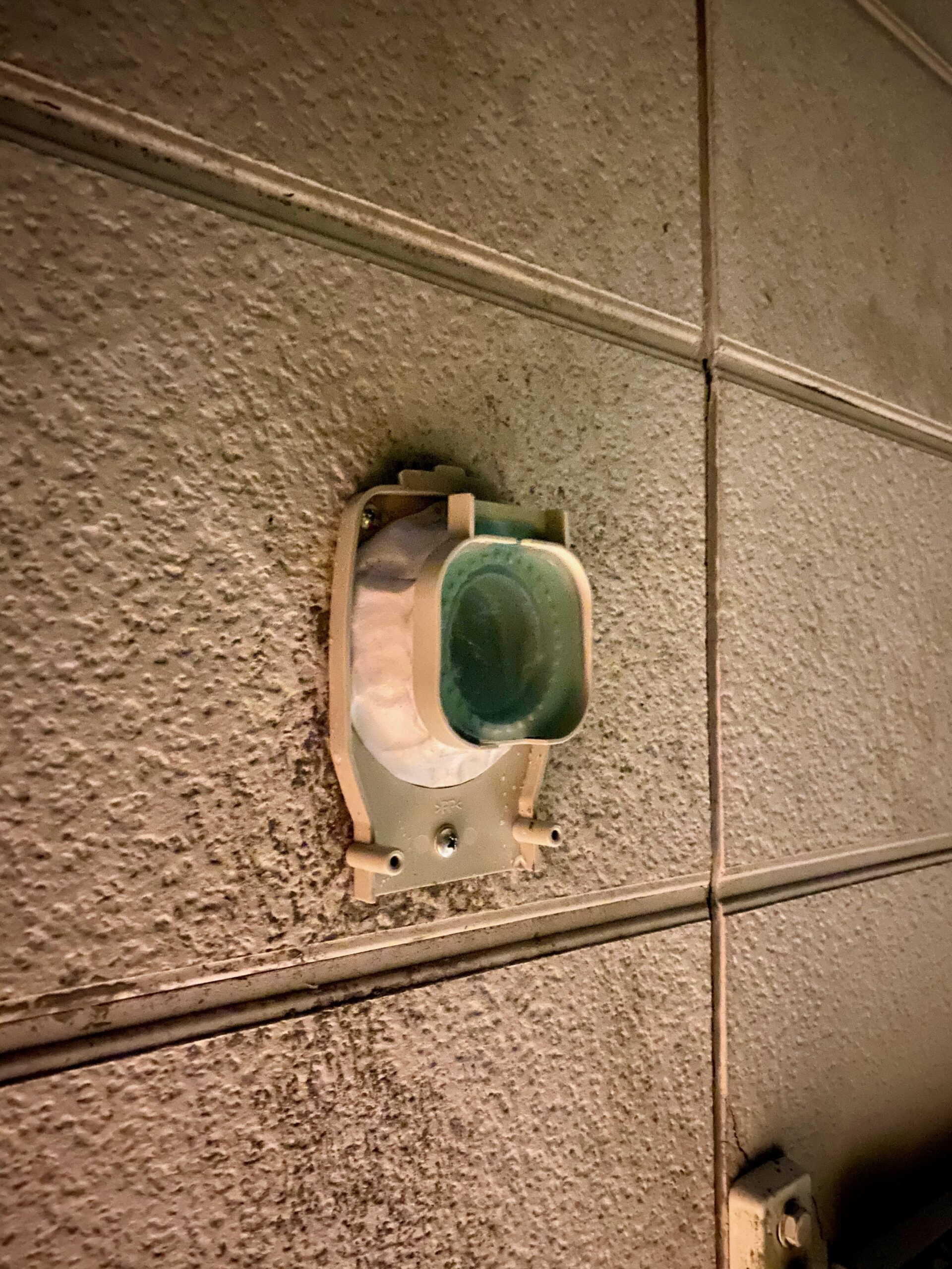 仮組みが終わり、枠を付けて、パテで埋めます。ホースに傾斜をつけつつ、最終的な出口は地面に対して垂直にしないと虫よけの蓋が開いてしまうので出口は垂直に調整します。