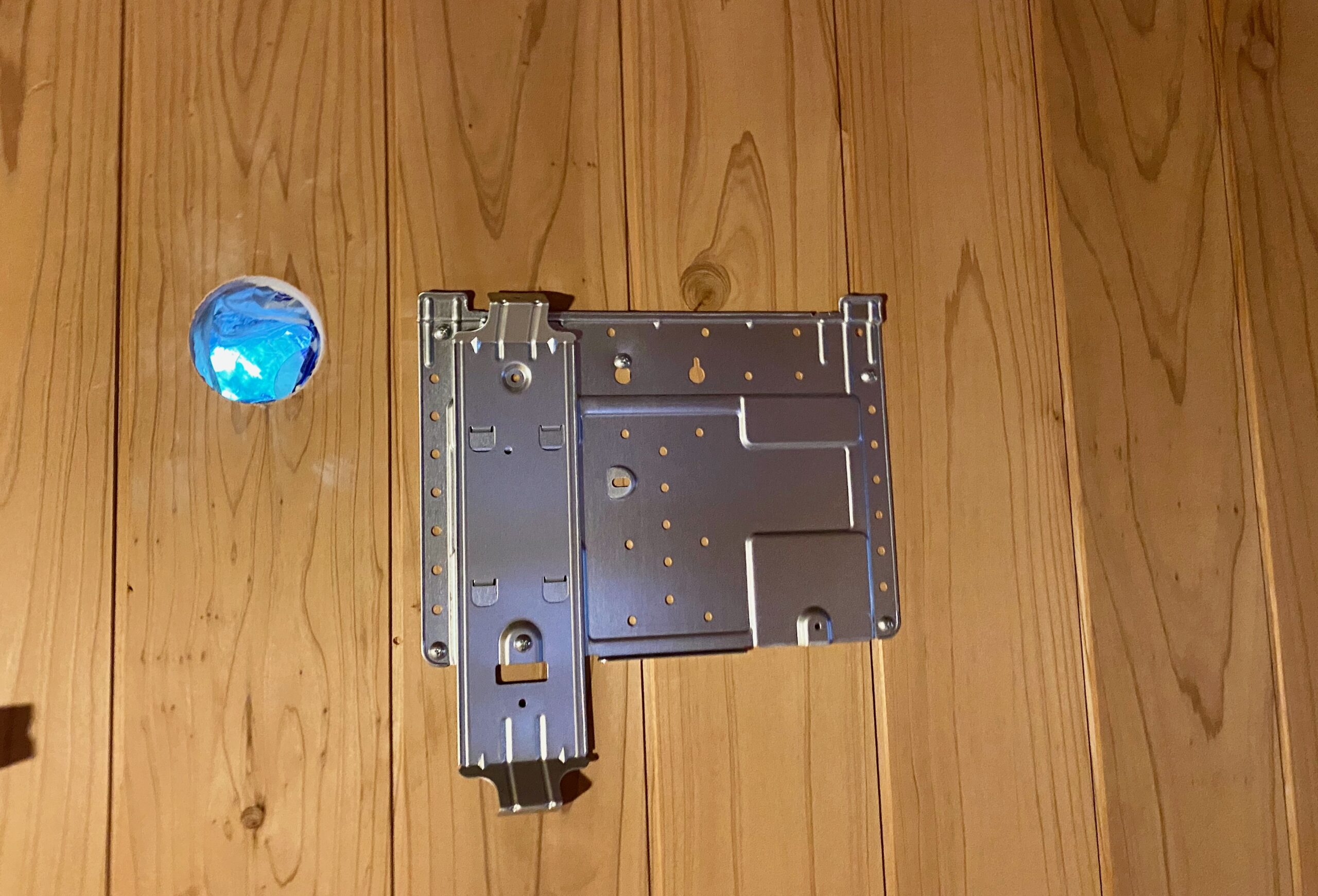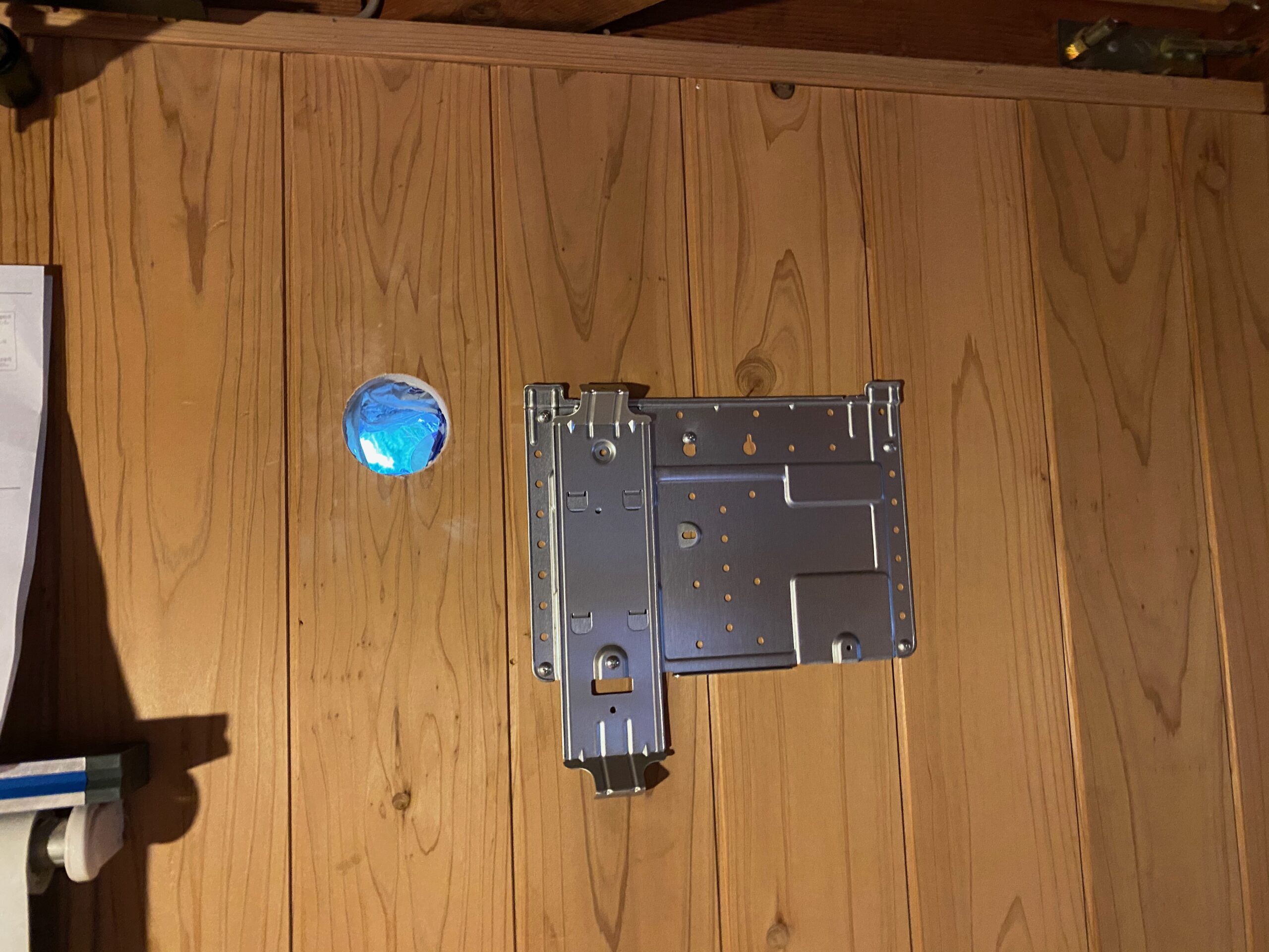 穴が空いたので、穴の位置から相対位置が決まっているカライエを取り付ける金具をテープで止めておきます。