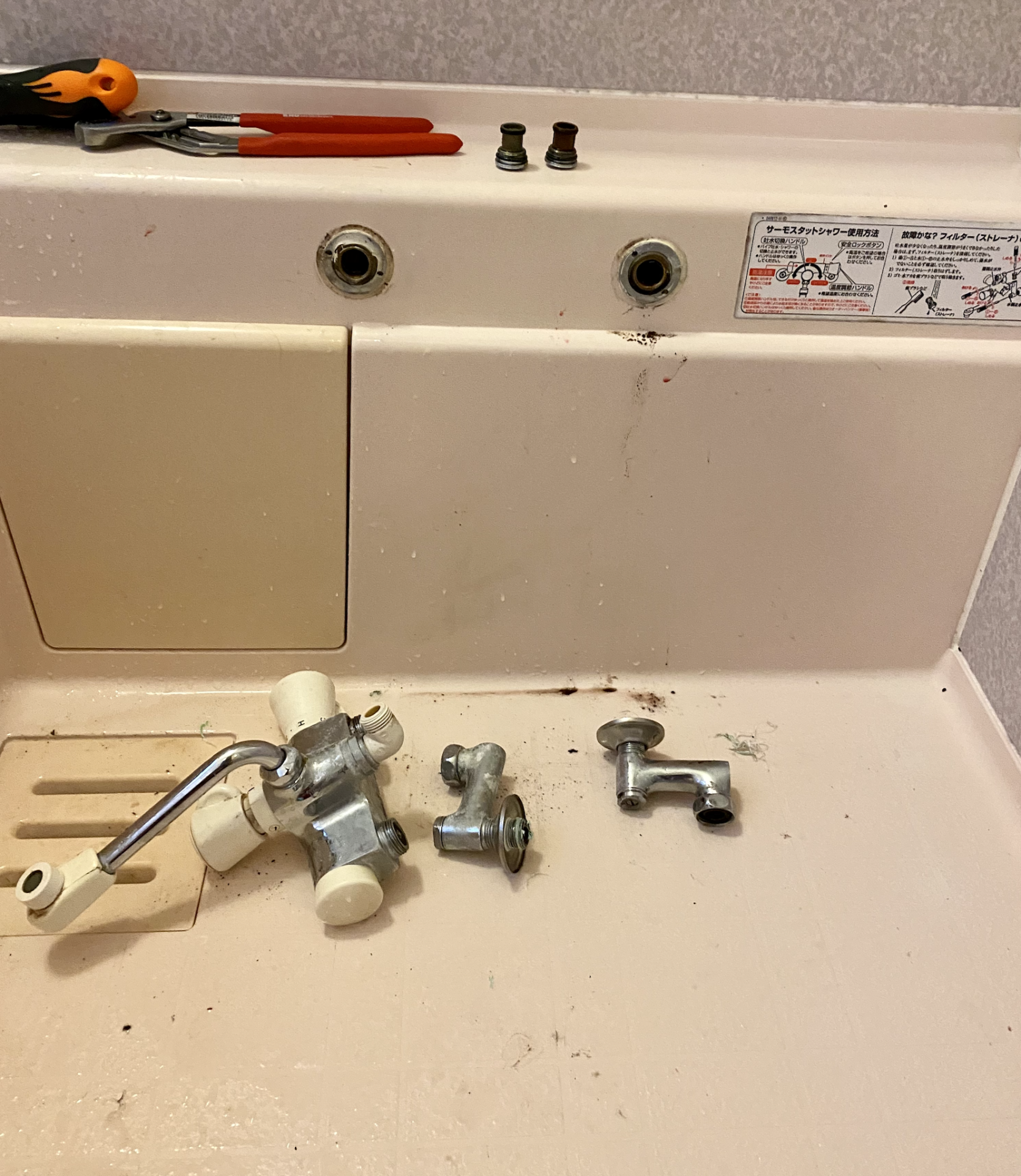 次に既存の水栓を取り外します。右側が水用のフィルターで、赤錆が付着しています。