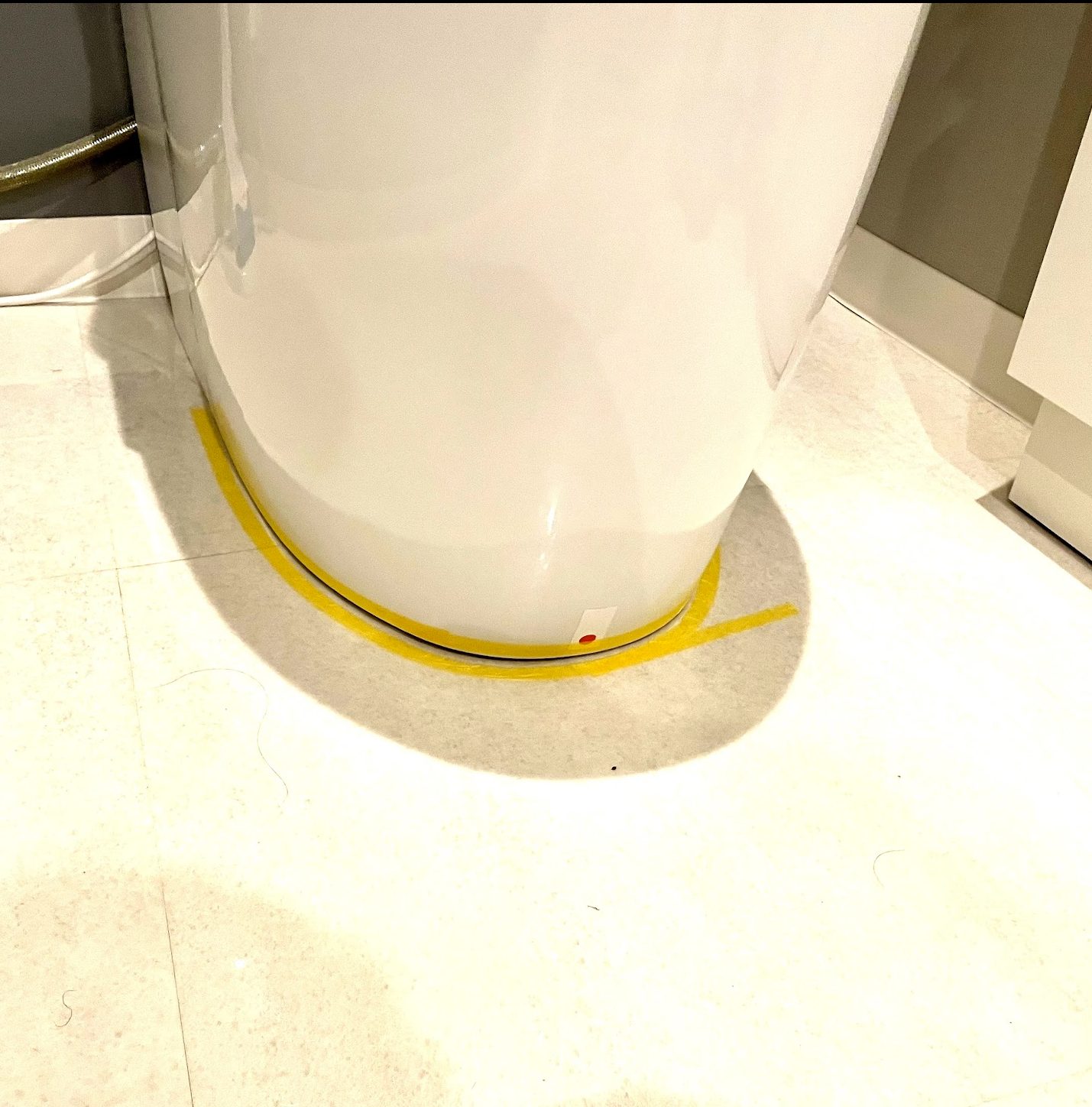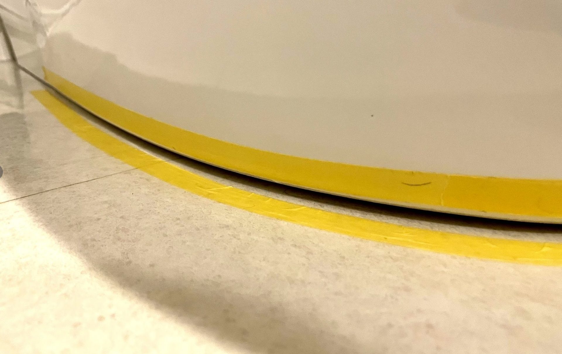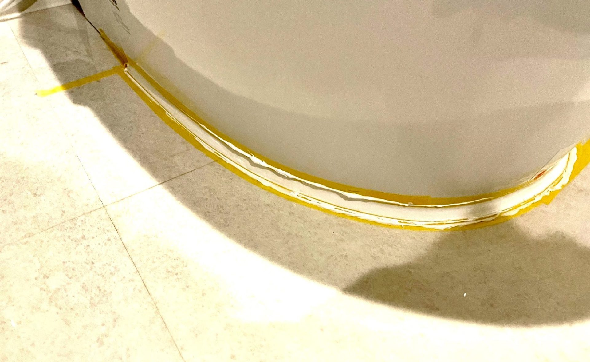 まずは、コーキング作業のためにマスキングテープで養生します。便器周りは曲線になっているため作業は難易度が高いですが、日常的に近くで見る場所ではないため、実用性を重視して作業を進めます。